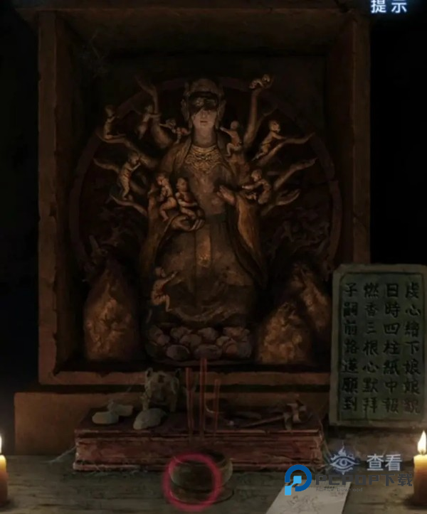 临摹完毕后窗子后面小高能不要被吓到,小高能后就可以下楼了,下楼来到走廊尽头送子娘娘位置,把【画像】先放在桌子上,然后对中间的香炉使用【三炷香】就能看剧情了,剧情有小高能注意,完成之后第一章结束~