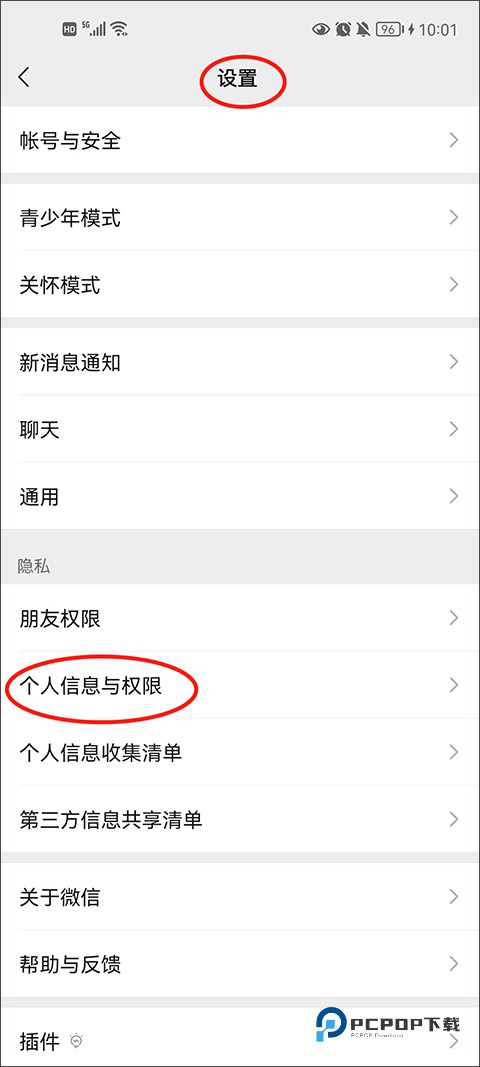 1、打开微信,找到【设置】功能,点击个人信息与权限。