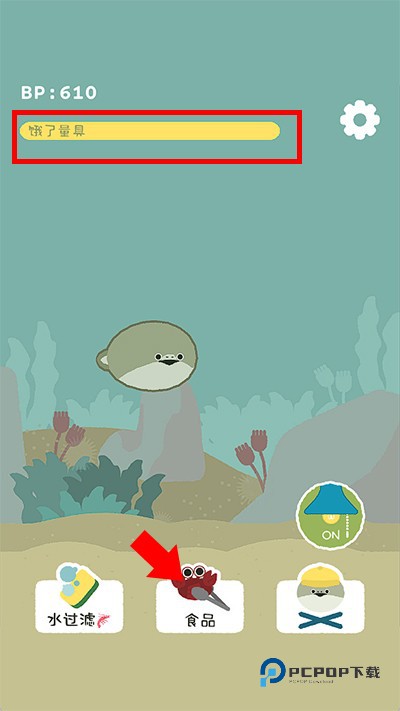 2、成功孵化后我们即可为萨卡班甲鱼投喂食物,萨卡班甲鱼的饥饿度可看上方的黄色进度条了解,投食时点击下方的食品按钮
