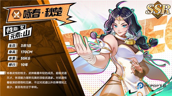 咏春武馆的馆主,武神殿最年轻的成员,超级武道天才,各项能力堪称完美的顶级武道家。对武道有着极深的领悟和见解,不过对武道以外的事情知之甚少,甚至有些过于单纯。