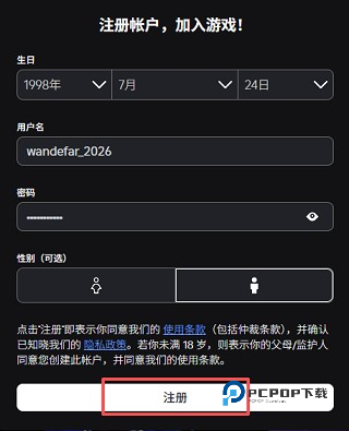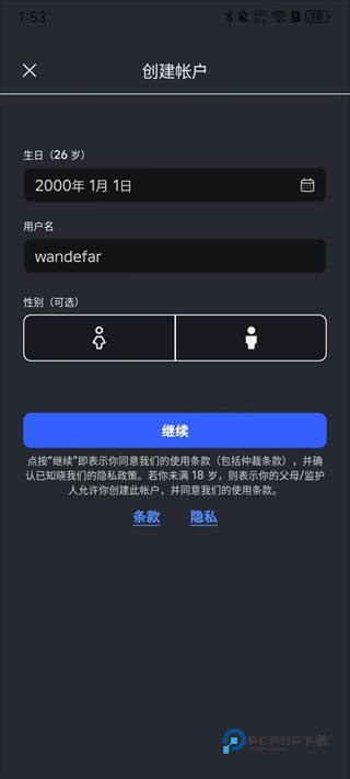 2、注册创建账户,输入你的出生年月和用户名,选择性别,点击继续。