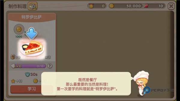 6、点击“学习”按钮,花费金币购买披萨的制作食谱。