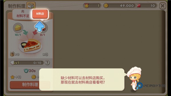 7、食谱学会后,进入制作阶段,但发现所需的食材还不够,点击“缺少的材料”进行补充。