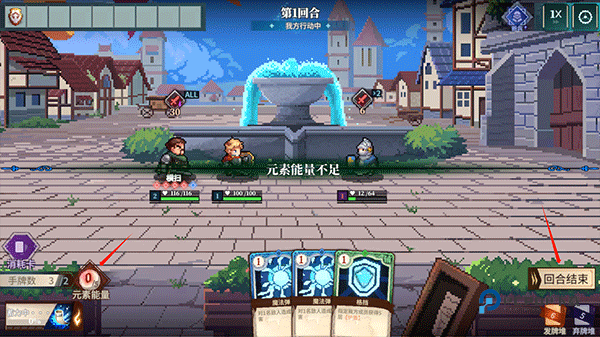 6、每个卡牌上会显示需要消耗的能量点,当左边能量点显示为0时,需要点击回合结束