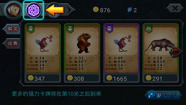 最先进的卡是紫色的,可以在商店直接购买。它比蓝卡和绿卡功能强大得多,并且不需要花费太多金币,因此您可以快速提高战斗力。