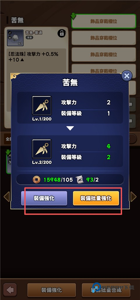5、玩家可以为忍者配置各类饰品,并通过强化系统提升属性,从而增强整体作战能力。