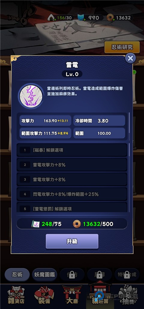 2、在每个阶段内,成功消灭指定数量的敌人即可触发忍术强化机会,玩家可选择解锁全新忍术,或对已有忍术进行进阶提升。