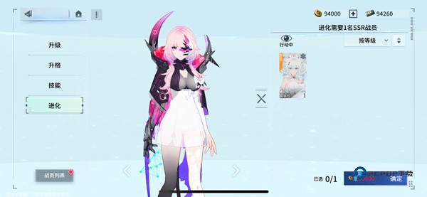 3、升格是消耗同名角色,SR升到SSR需要四个同名角色。但升到SSR之后就不能升格了,需要去点进化。进化就比较舒服了,只需要是同等级稀有度的都可以当作材料。至于后面进化的方向和级别还暂未了解。