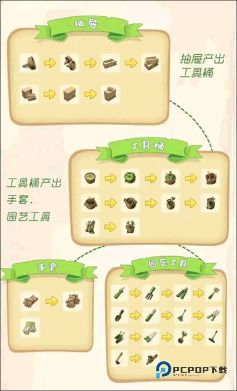 首先是工具这类的,园林工具可以说是我们在游戏过程中最想需要的一类物品了,我们在获得基础的园林工具前,需要先获得工具桶,工具桶会在一段时间后给大家提供工具,等发完后将会进入到冷却阶段,需要等到冷却结束才可以再次给大家提供工具,而工具桶则是需要抽屉来获取,下图就是工具类的合成图。