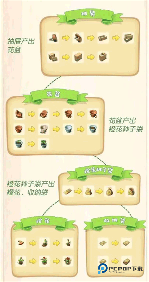 花和收纳袋这类可以有效地让我们的庄园更加漂亮,这些都是通过种子袋获取,而种子袋由花瓶产出,花瓶是从抽屉那获取的,合成图我放在下面了。
