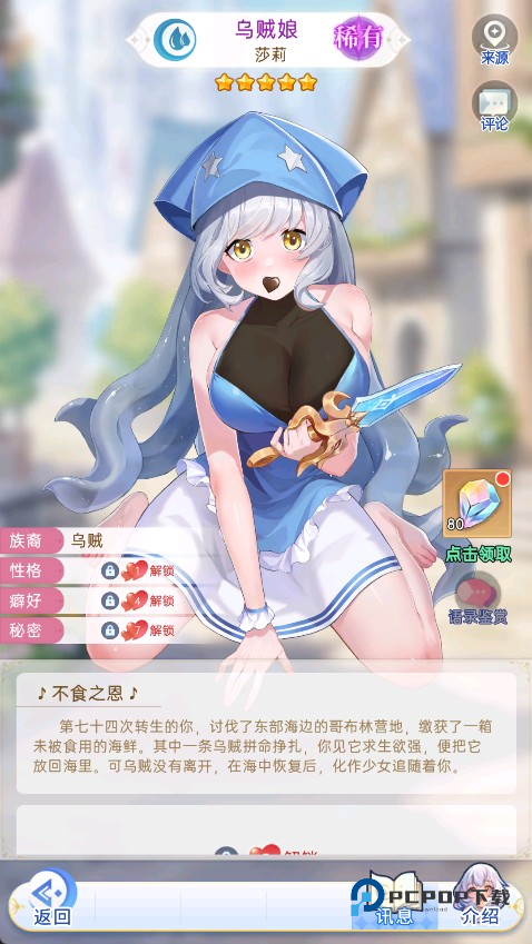 第七十四次转生的你,讨伐了东部海边的哥布林营地,缴获了一箱未被食用的海鲜。其中一条乌贼拼命挣扎,你见它求生欲强,便把它放回海里。可乌贼没有离开,在海中恢复后,化作少女追随着你。