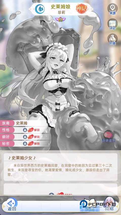 来自异世界西方的史莱姆洞窟,在洞窟中的她因为见过第三十二次转生、来洞窟寻宝的你。她渴望爱情,娘化成少女,跟踪你走出了洞窟。