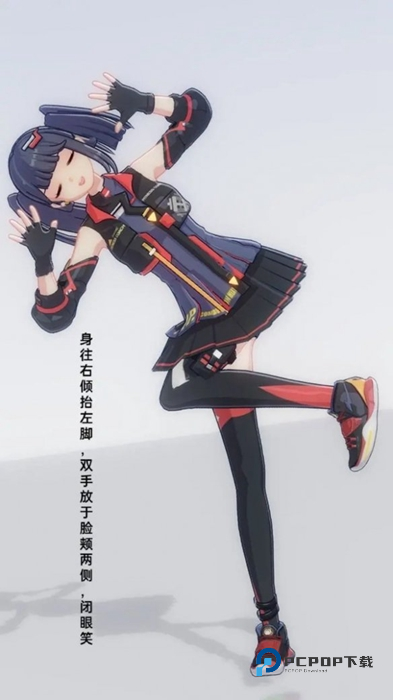 2、身体往右倾斜,抬左脚,双手放于脸颊两侧,闭眼笑。