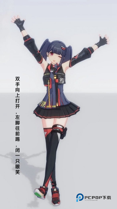5、双手向上打开,左脚往前踢,闭一只眼笑。