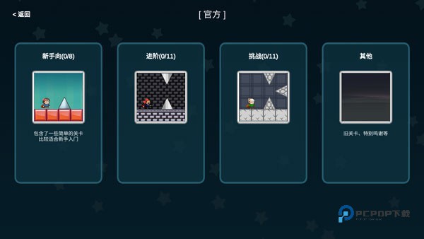 目前共10个官方关卡、其中纯跳刺关卡2张、特殊跳刺2张、纯坑向关卡3张、小游戏关卡一张、探索关卡一张、世界关卡一张(内置36个小关卡)。