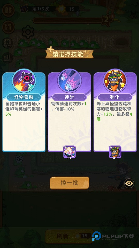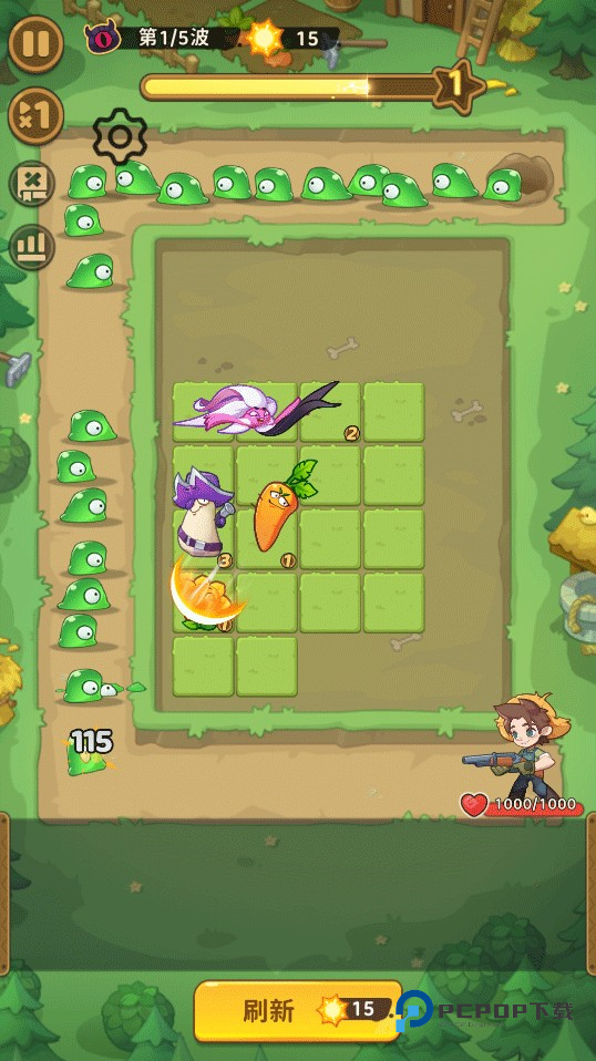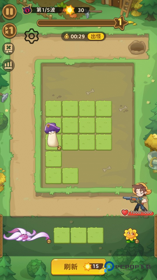 2、使用阳光刷新格子,获取新的植物加入阵容。
