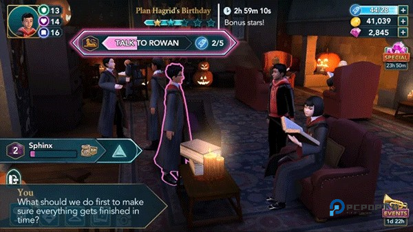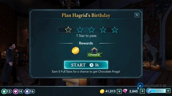 1、本演练将从一名二年级学生的角度介绍游戏。由于一年级及以上的学生可以参加冒险活动,因此根据你当前的主要故事进度,某些任务的星级和属性要求可能会有所不同。一旦你到了那里,你就可以和一些学生互动了。点击他们上方的演讲气泡,看看他们要对你说什么。之后,邓布利多会告诉你海格的生日很快就到了,他希望你帮他组织一个惊喜派对。