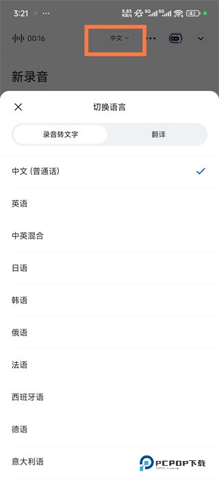 2、即可开启录音可点击语种进行切换