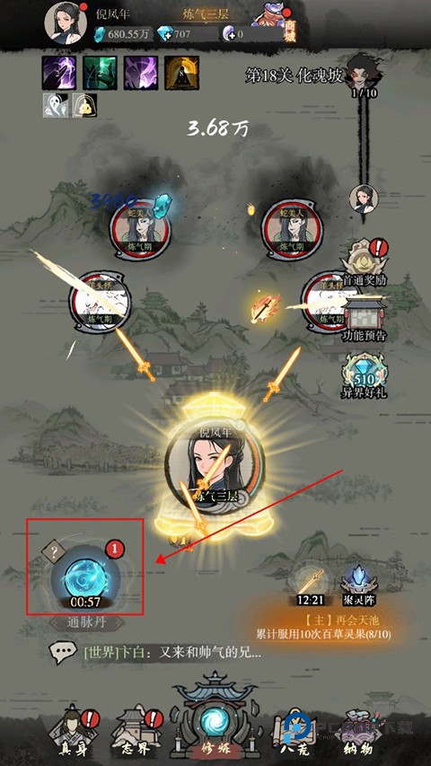 游戏中主角将持续进行自动闯关,左下角的奇遇事件会定时刷新,玩家只需点击即可收获道具、战斗增益等助力,合理利用可大幅提升战斗效率。