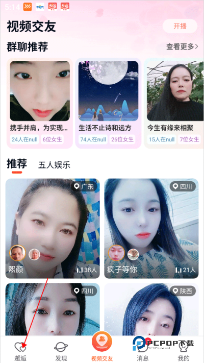 1、打开乡遇交友软件,进入到视频交友首页,点击左下角的“邂逅”按钮