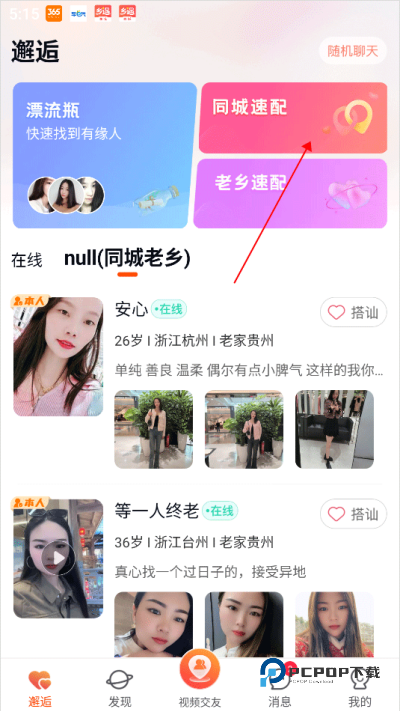 2、进入到邂逅页面,再点击上方的同城速配或者老乡速配选项