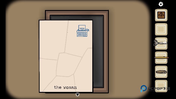 5、将五个碎片全部放在相框上获得提示「the woman」(中间有一个空格),点击打字机输入英文后出现一张纸,用铅笔涂抹纸上出现的男人、门、女人等,最后涂抹钥匙图案获得「钥匙」