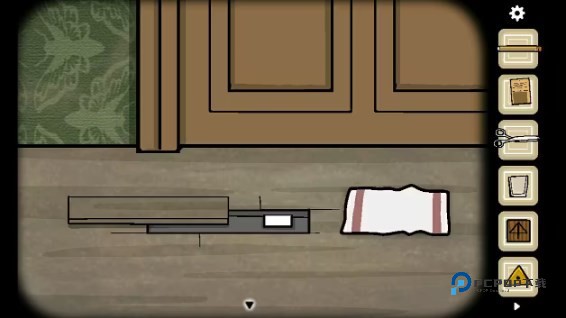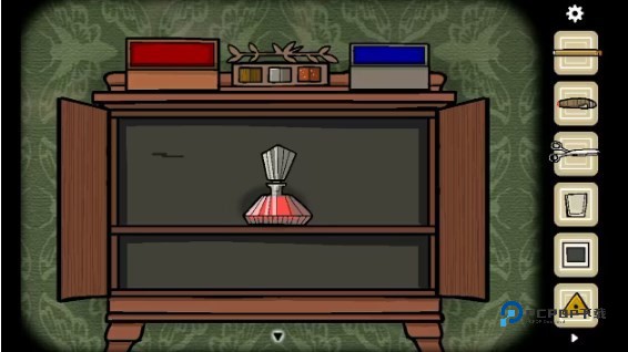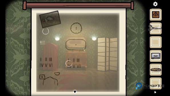 1、拿走衣架上的「大衣」,打开旁边的三层抽屉,拿走里面的「剪刀」、「照片碎片」和「铅笔」,打开门旁边的开关,来到右边拿走灯罩里的「照片碎片」