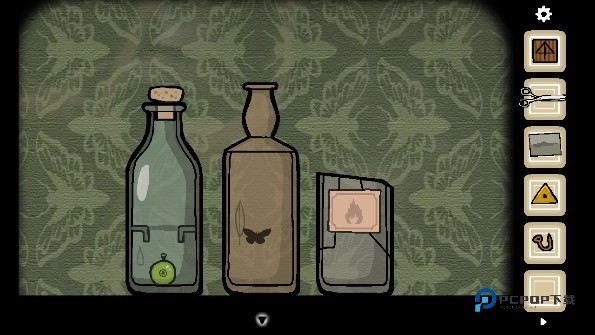 18、点击毛毛虫吃掉叶子化成飞蛾后,来到沙发处,用剪刀剪开沙发获得「线」,拿走杯子,将文件柜上瓶子里的液体用杯子装上,将液体倒入第一个瓶中,将线绑在瓶塞上,再放上钩子后获得「绿色眼球」