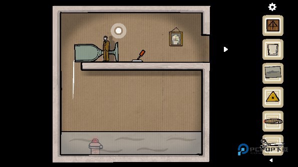 22、首先,控制男主从原始房间进入黄色房间,再进入粉色房间后坐电梯到达棕色房间,控制小人推到水杯,然后来到相框处退出小房间