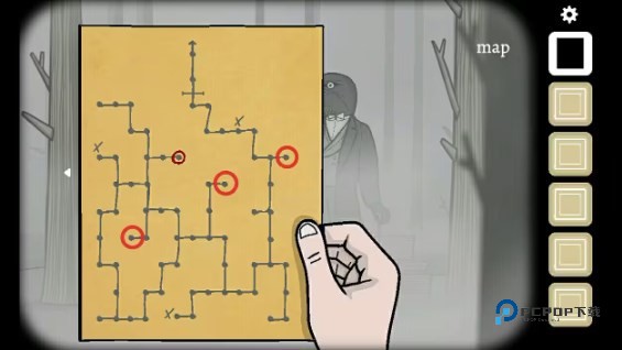 33、根据地图指示到达有画×的地方,在画叉的地方有一块石头标明了其他路线,根据石头的路线到达位置后会获得一个「雕像」,在去第三个画叉的地方时会遇到黑影,点击黑影身上出现的光圈即可劝退,收集最后一个雕像后按地图来到最终点,将三个雕像放入大门的凹槽内,打开大门