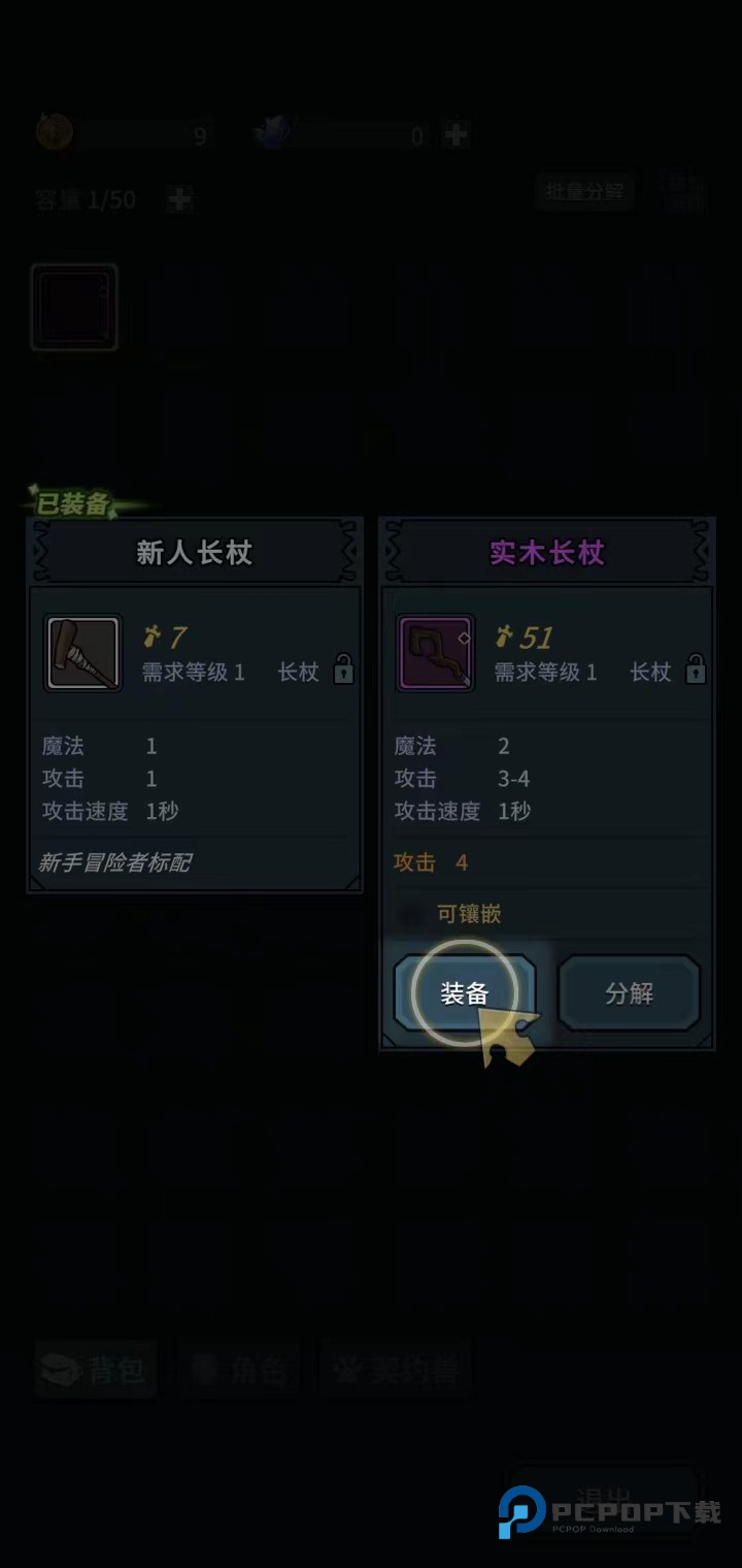6、走到怪物身边角色就会自动攻击怪物,将怪物打倒后,可以拾取随机掉落的装备,用上后可以提高角色的攻击力。