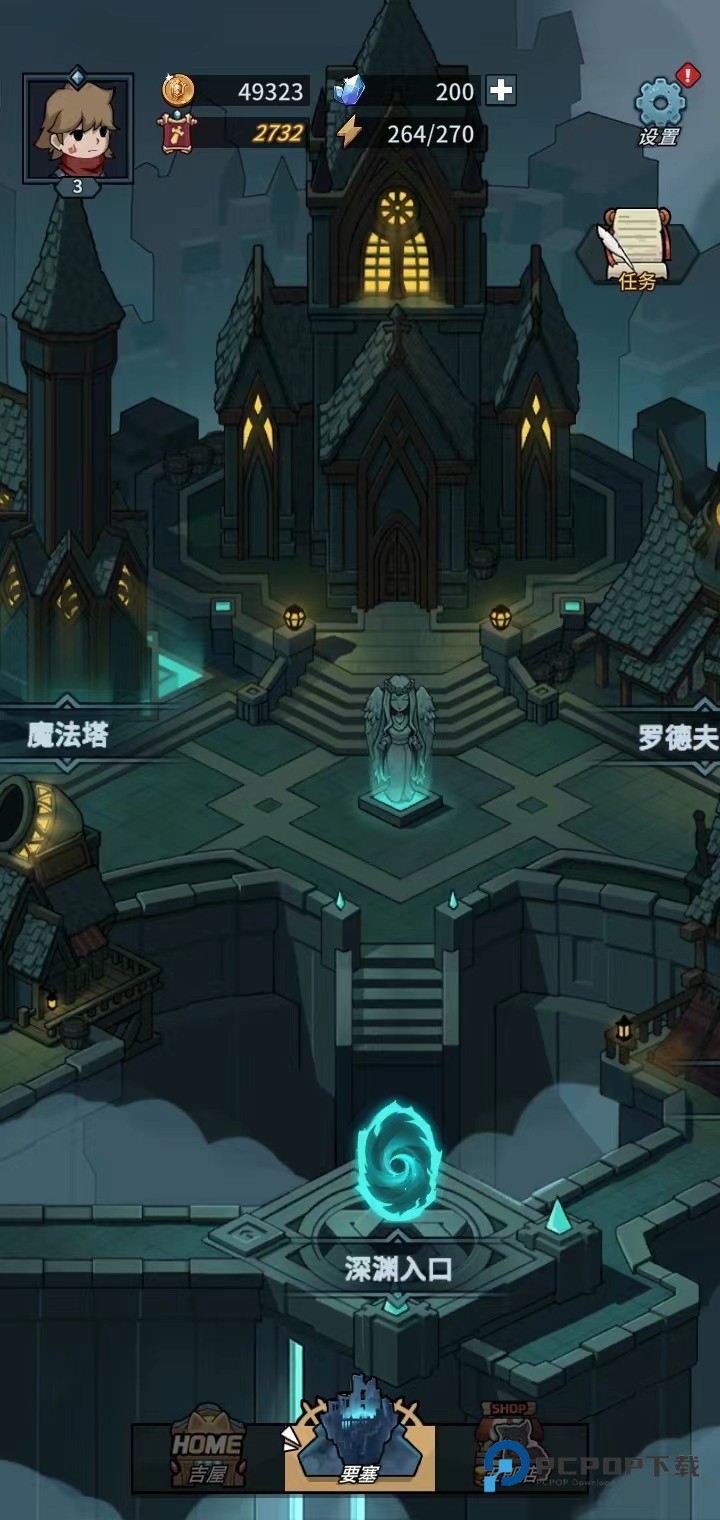 8、在这里,可以查看任务,可以在罗德夫小屋进行宠物的召唤,可以在魔法塔进行技能的升级,可以在仓库中进行物品的装备,还可以点击深渊入口进行探险。