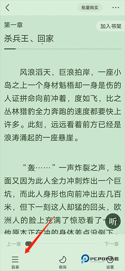 2、点击进入小说阅读,点击左下角目录,如图所示