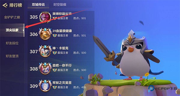 2、然后点击【顶尖玩家】就可以查看你在全区的排行了,不过只能看到前500名。