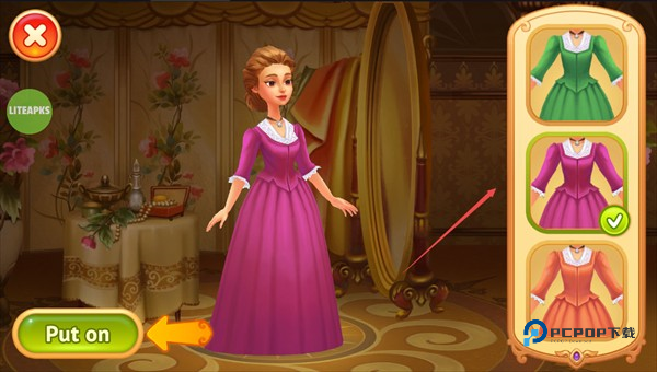 2、你可以选择不同的裙子来装扮角色,点击“put on”进行游戏