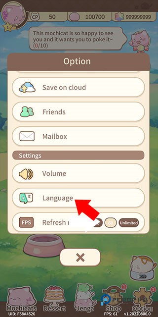 1、首先下载并打开麻薯猫收藏最新版游戏后,其默认语言为英语,所以先点击下方的齿轮按钮