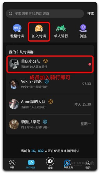 3、只需要一位成员发起对讲,其他成员加入该骑行即可。