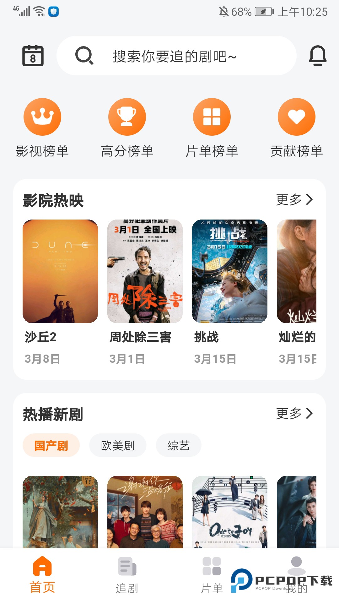 1、打开追萝卜追剧app,进入首页界面,包括影视榜单、高分榜单、片单榜单和贡献榜单,以及影院热映和热播新剧等分类,