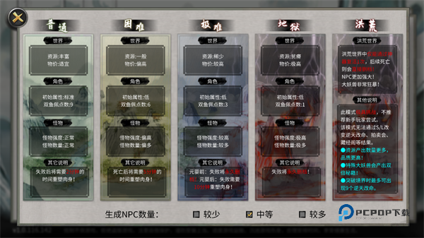 2、游戏开局难度分为普通、困难、极难、地狱、洪荒等等;