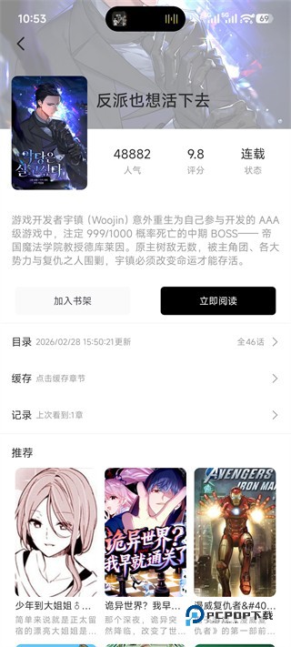 点击任意漫画封面,进入作品详情页,可查看人气值、评分、连载状态、完整剧情简介,还能点击【加入书架】或【立即阅读】。