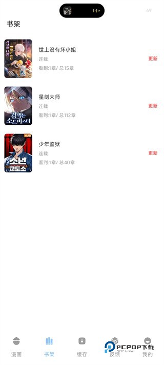 点击底部【书架】进入书架页,可查看已收藏的漫画,直观看到每部作品的连载状态和自己的阅读进度,方便后续追更。
