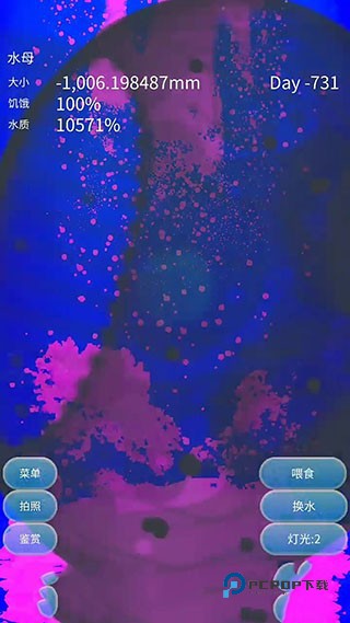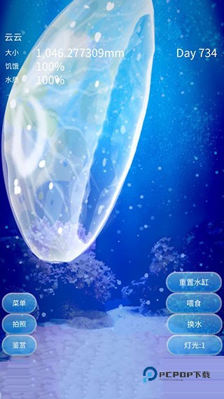 玩家在游戏中不断喂食、换水养育水母,水母逐渐长大后即是升级,玩家可以给长大后的水母换水缸。