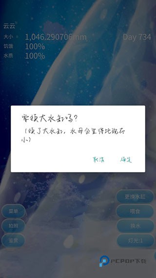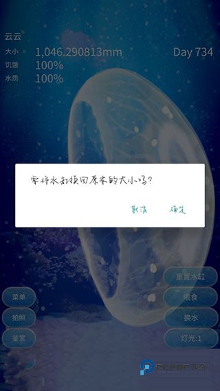 调时间到了2年,重置后,喂满了食物和水后,把时间依次往后调,终于把水母养成了转个身都困难的模样,接着下一天,游戏提醒要换一个大水缸,如图。