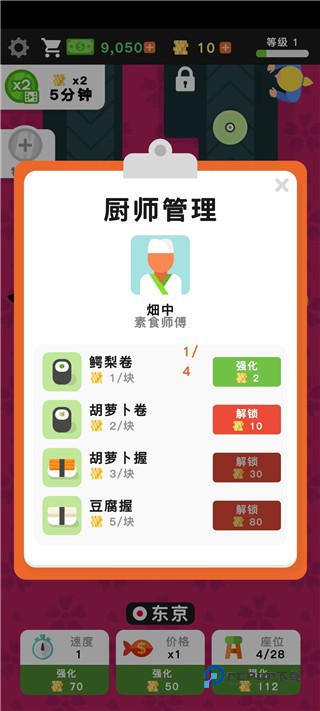 2、解锁并升级顶级厨师,提升寿司品质