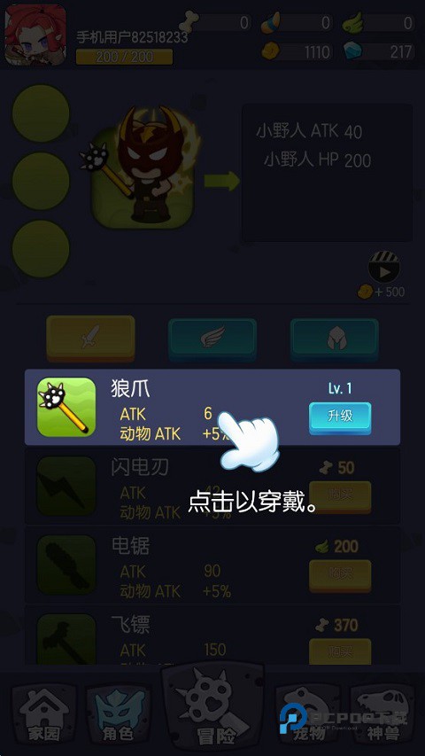 3、在底部的“角色”系统内,可以给小野人穿戴装备,点击即可穿戴。