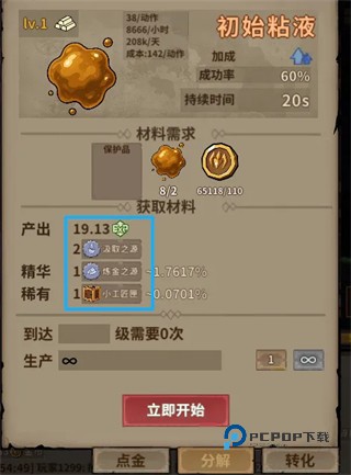 接下来是转化,转化可以理解为炼金当中的强化,同样具有极强的赌狗性质,还是以粘液为例。目前市场上一个粘液的价值大概是10金币左右,但是两个粘液转化的壳皮却可以卖到几百金币,这样大家应该就基本了解转化是干嘛的了,而且只是比较初级的材料,还有些更高级的几百万转一次的材料大家可以自行了解一下。转化目前的主要玩法基本就是高价值宝石当赌狗,转叶子做药水一条龙。总体而言转化属于是比较赌狗的玩法,建议是前期别玩,有钱再来。