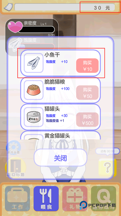 3.在此修改版本中,礼物的价格降低为零,好感值不会降低,一旦装满,小猫将永远不会饿。