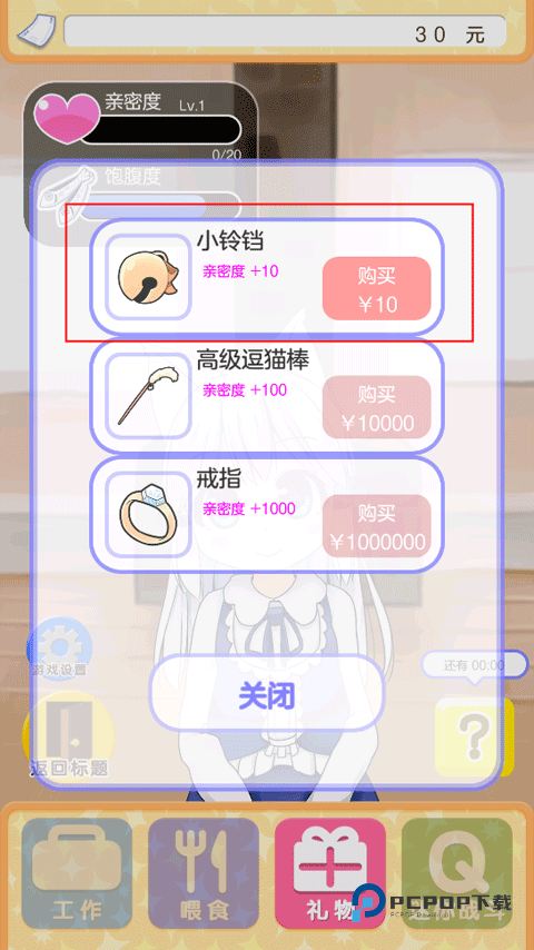 3、游戏中的亲密度主要依靠送礼物进行提升,虽然点击进行触摸的时候,也可能出现少量的亲密度提升,但我们还是自己忽略看礼物。礼物系统很简单很暴力,只有3种,第一个提升10点亲密度,第二个提升100点,第三个提升1000点。虽然这个很直接,但是礼物系统会越卖越贵,就是礼物会越来越贵,这个涨价速度只靠工资是绝对供不起的,不过一个角色需要的亲密度只要2000点就能完成攻略。
