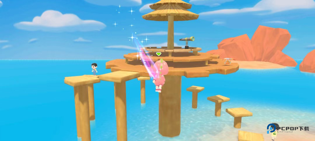 1、找到图中浪漫海岛上的观景台。(需要通过跳梅花桩到达顶部哦)