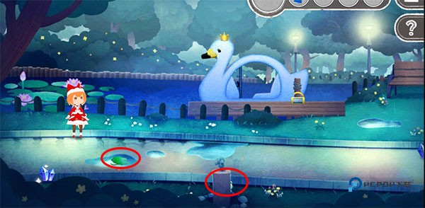 3、然后我们依旧在天鹅船这,先捡起水坑中的荷叶,以及找到旁边柱子里藏着的青蛙